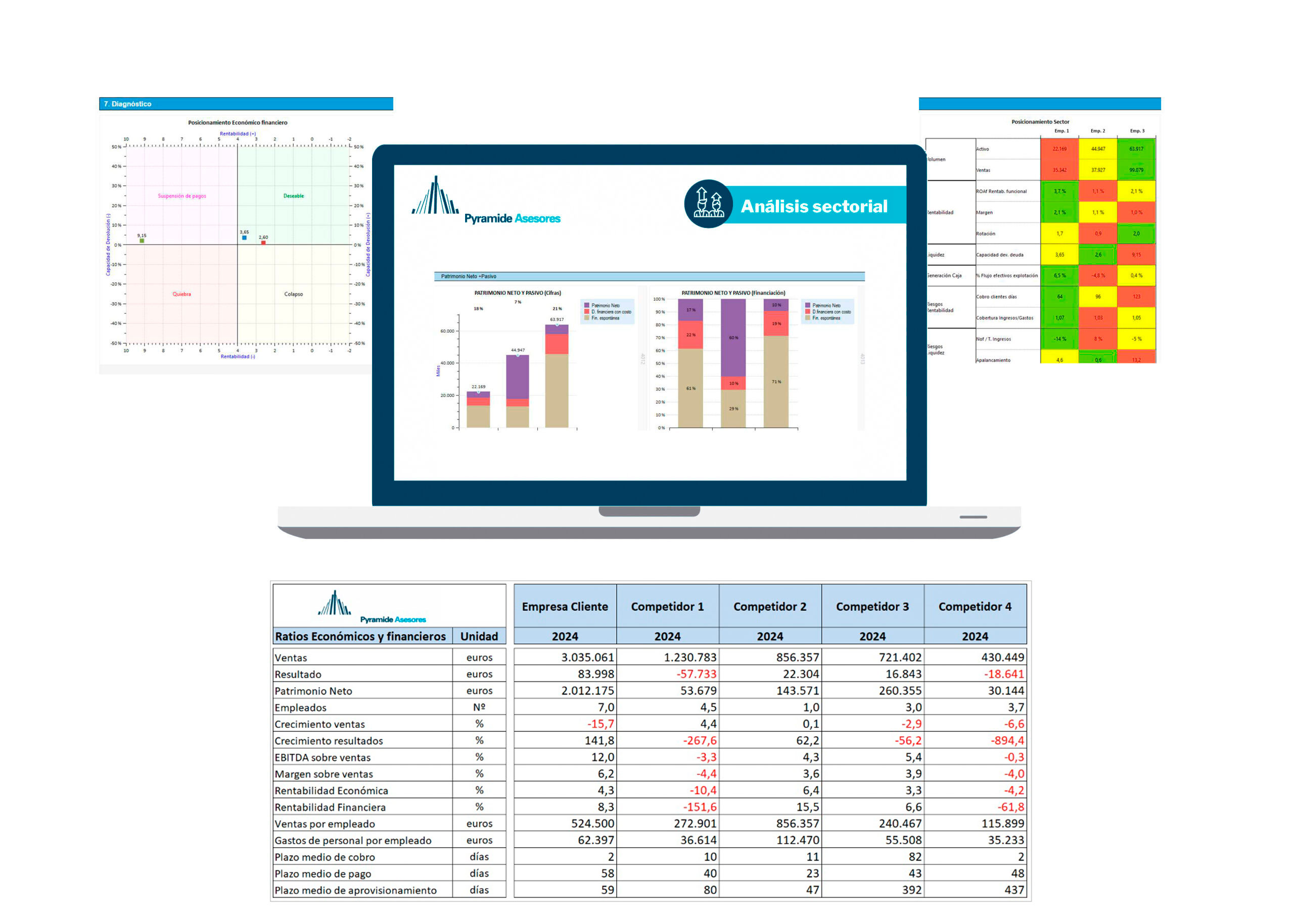 Nuestro servicio de Estudio Sectorial es una herramienta que convierte los datos en decisiones estratégicas. Compara tu empresa con las principales del sector mediante gráficos y ratios precisos, obteniendo conclusiones financieras y estratégicas que realmente importan.